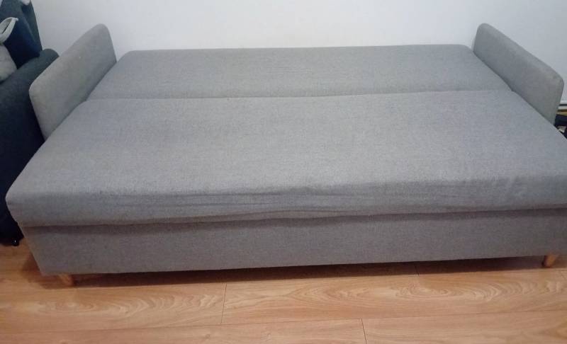 Sofa z funkcją spania oraz skrzynią na pościel, kolor jasnoszary. Powierzchnia spania 140x190