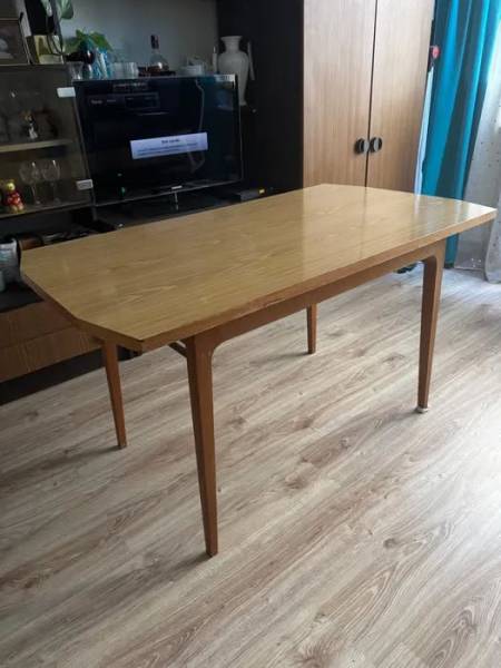Na sprzedaż oferuję oryginalny stół z okresu PRL, projektu Rajmunda Hałasa – kultowy mebel w stylu vintage Świetnie wpisuje się w klimat retro, idealny do mieszkania w stylu lat 60./70.