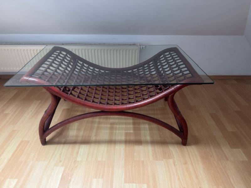 Zestaw: stolik kawoy ze szkłem, rattanowa toaletka do sypialni, biurko z drewna w stylu vintage i stylowy stolik kawowy (elegancki ciemnobrązowy rattan i tafla szkła)
