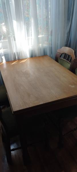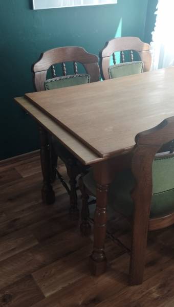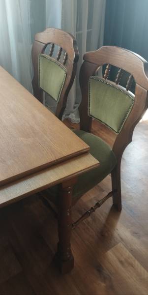 Niemiecki komplet został wykonany na zamówienie. Jest z prawdziwego drewna i posiada 6 krzeseł w oliwkowych obiciach. Stół rozkłada się z dwóch stron. Jest bardzo duży i masywny. Posiada ślady użytkowania są to delikatne zabarwienia i rysy. Komplet posiada 7 elementów.