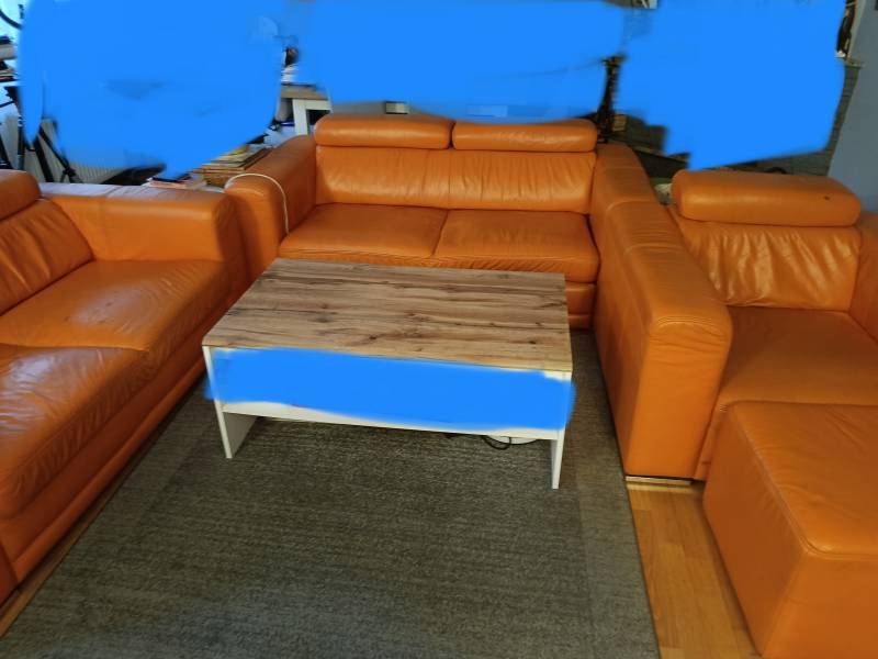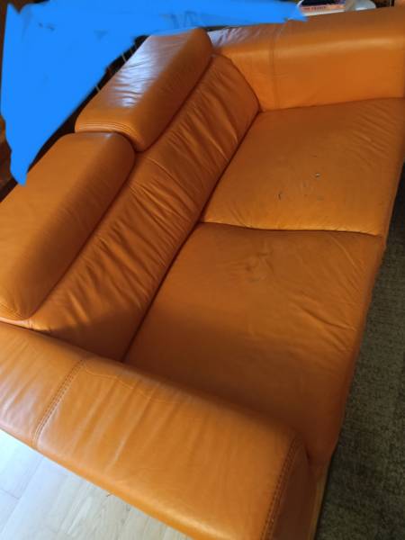 Siedzisko na jednaj sofie - 2,5 wymaga renowacji, na fotelu jest jedno otarcie, a sofa 2 wymaga renowacji części rozkładanej. Kolor jest nadal bardzo intensywny.
