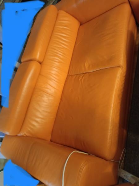 Mam do sprzedania meble ze skóry naturalnej w kolorze soczystej pomarańczy. Komplet składa się z: sofy 2,5, sofy 2 - rozkładana, ale wózek wymaga delikatnej regulacji, fotel 1 i pufa.