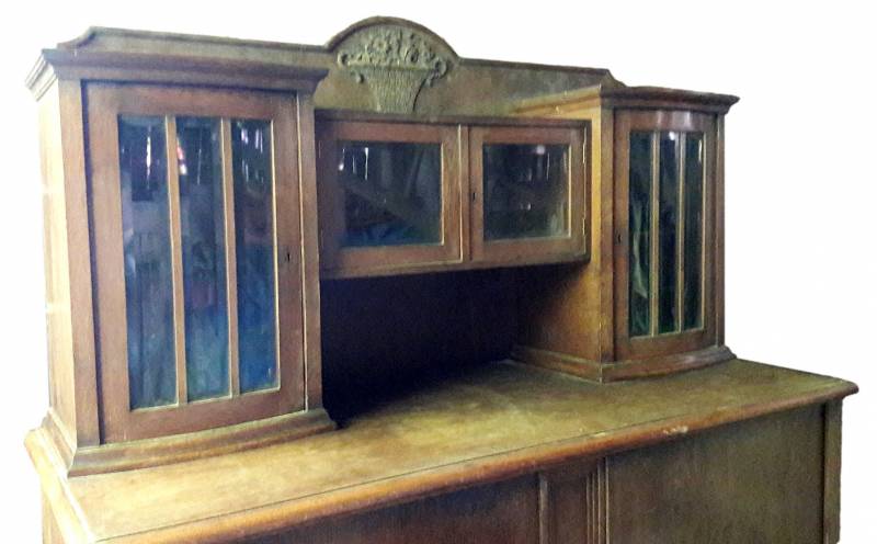 Kredens jest duży i ciężki, w kolorze drewna, z którego został wykonany. Jest w bardzo dobrym stanie. Są wszystkie kluczyki do witryn i części dolnej. Moim zdaniem, ale nie jestem pewna, pochodzi z dwudziestolecia międzywojennego.