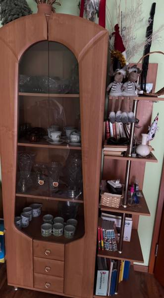 Meble do pokoju przeszklona witryna szafka z półokrągłą szybą komoda stojak i mniejsza szafka