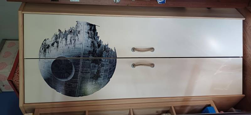 Sprzedam szafę rogową do pokoju dziecięcego. Szafa jest bardzo pojemna, w środku ma dwa rzędy półek oraz rurkę do powieszenia ubrań. U góry znajduje się półka, która sięga w głąb rogu szafy. Boki oraz wnętrze szafy w kolorze jasnego drewna. Drzwi szafy pomalowane na kolor ecri z naklejką Gwiazdy Śmierci. Po otwarciu drzwi ma się dostęp do całej szafy.