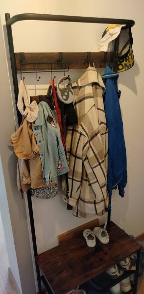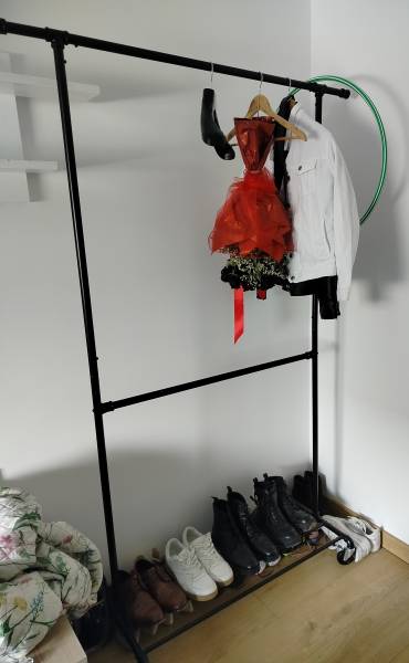 Wieszak na kurtki na korytarz wraz z półkami na buty