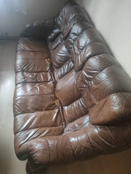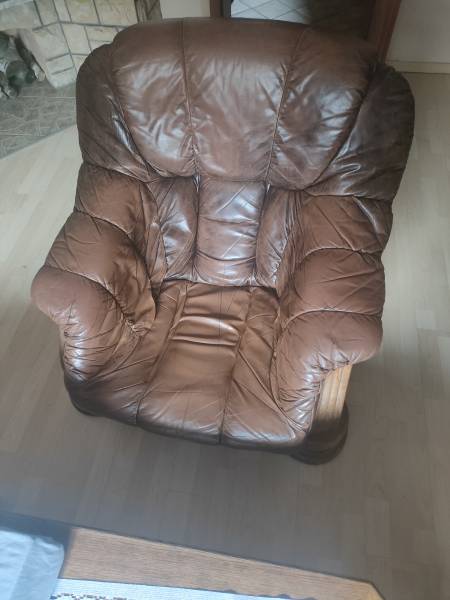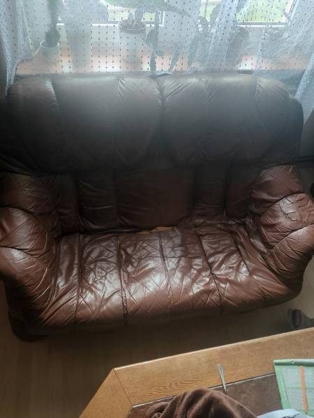 Skórzany zestaw wypoczynkowy do salonu: Zestaw sofa 3 osobowa, sofa dwu osobowa i fotel. Zestaw używany. Skóra do niewielkiej renowacji. Solidny dębowy stelaż.