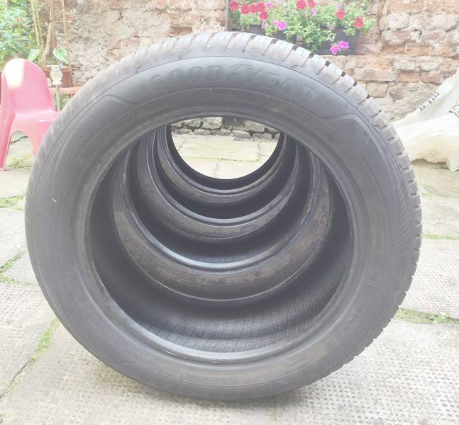 Opony Goodyer wielosezonowe używane - przejechanych 4500 km, stan b. dobry. Rozmiar 215/55/R 17 98W. Opony były używane do SUZUKI VITARA HYBRID>. Dodatkowo do sprzedania koło dojazdowe do Suzuki - " 16" - nowe