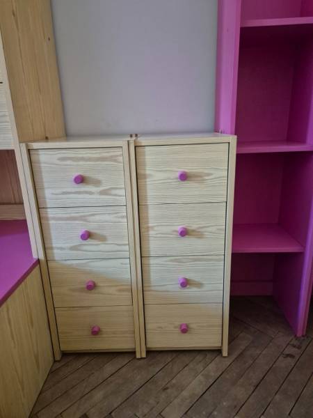2 szafki po 4 szufladki – funkcjonalne, każda z różowymi pokrętłami, świetne do przechowywania przyborów, zabawek.