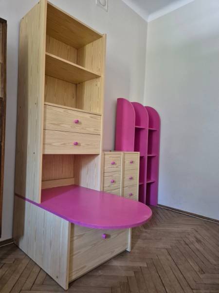Na sprzedaż wyjątkowy, nowoczesny, 5‑elementowy zestaw mebli dziecięcych w kolorze różowo (fuksja) ‑ jasnym sosnowym, idealny do pokoju przedszkolaka lub młodszej uczennicy. Zestaw solidnie wykonany, praktyczny i przyjazny dzieciom.