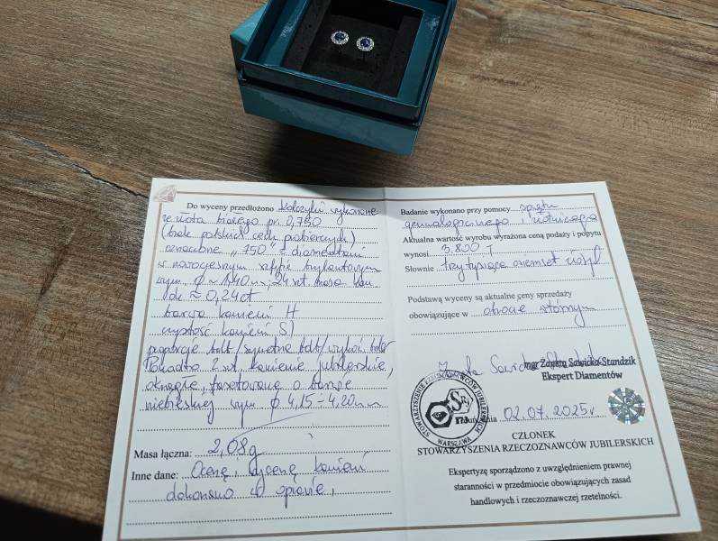 Sprzedam kolczyki z białego złota pr750, wysadzane szafirami oraz diamentami o nowoczesnym szlifie brylantowym 12szt w jednym i 12szt w drugim kolczyku 0,24 CT, barwa kamieni H, czystość kamieni SI. Posiadam do nich certyfikat.