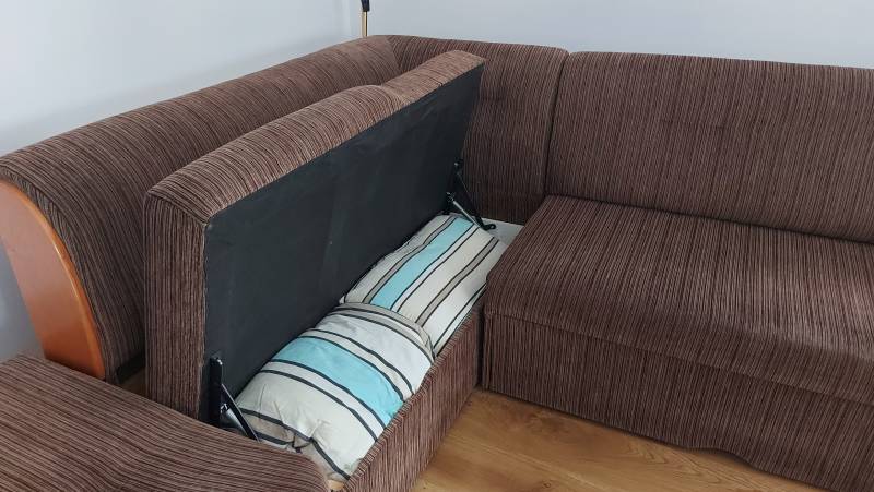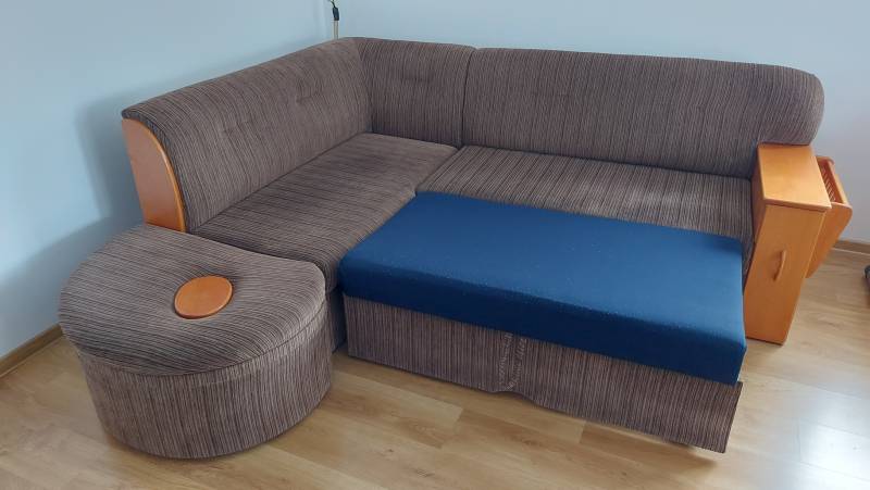 Narożnik używany stan dobry+, na sprężynach kolor brąz, drewniany barek wysuwany i gazetnik z funkcją spania, 2 pojemniki, wymiar zewnętrzny ok 215x240. (Narożnik znajduje się na terenie gminy Brzeźnio).