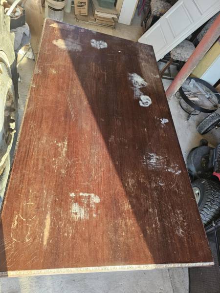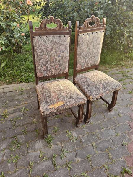 Stół posiada piękne, ręcznie rzeźbione detale, a krzesła zdobione są tapicerką w klimacie gobelinowym. Obecnie komplet nosi ślady użytkowania (widoczne zarysowania blatu, zużyta tapicerka na siedziskach), ale dzięki temu świetnie nadaje się dla osób, które cenią sobie prace renowacyjne lub szukają unikalnych mebli w stylu vintage/antyk.