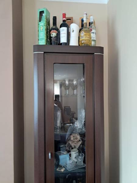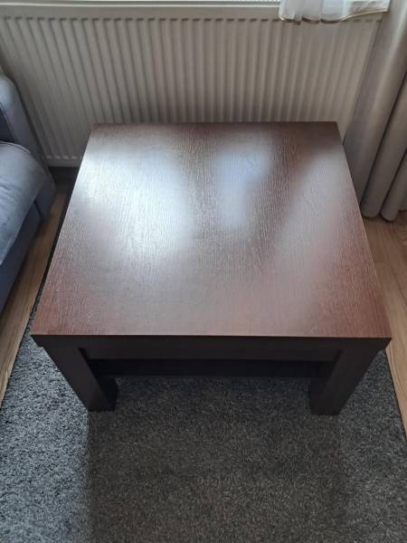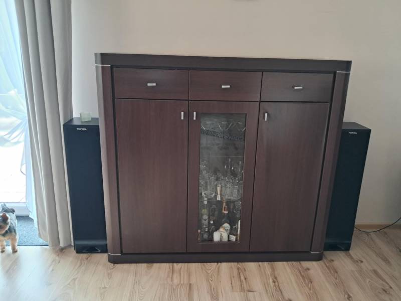 Stan dobry. W skład zestawu wchodzi komoda, witryna, stolik kawowy, półka, szafka rtv. Uszkodzenia: pęknięta okleina na drzwiach frontowych komody. (Podklejona)