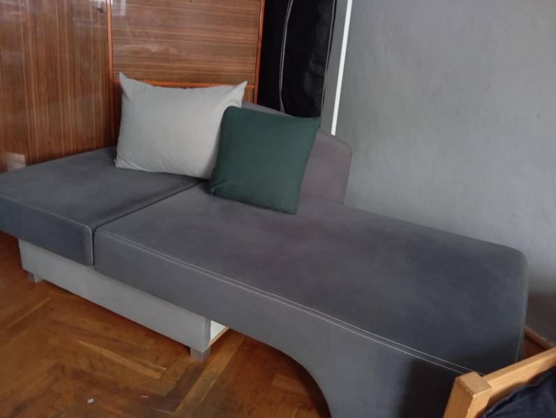 Tapicerka niezniszczona. Przy rozkładaniu mechanizm idzie trochę opornie i krzywo (najprawdopodobniej wina brakującej śrubki). Do tapczanu dołączone są dwie poduszki.