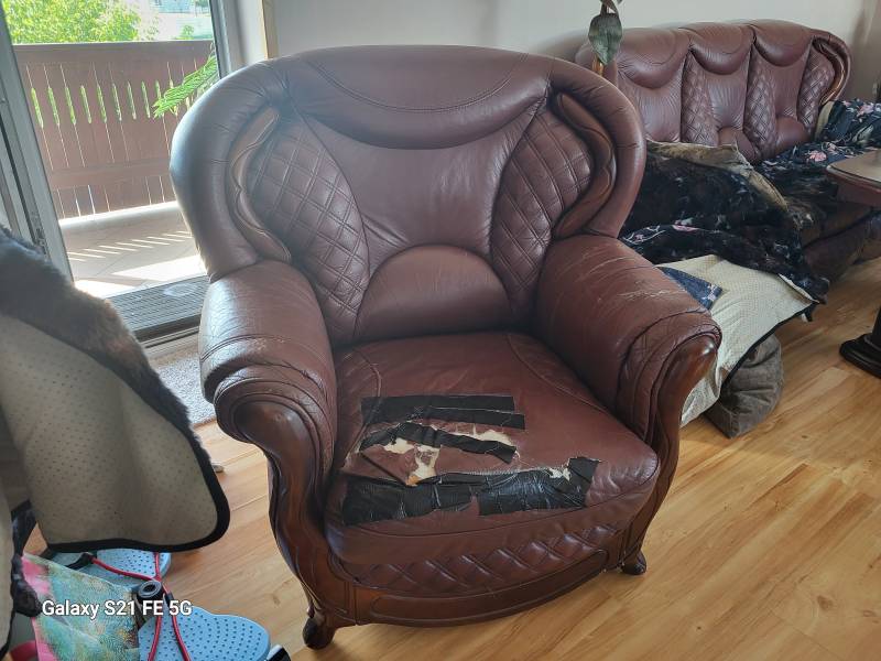 Komplet ma uszkodzoną skórę na siedziskach więc jest do renowacji