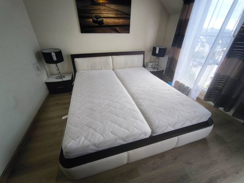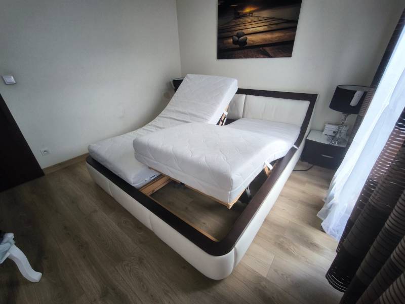Łóżko posiada dwa elektrycznie podnoszone stelaże w rozmiarach 90x200 cm.