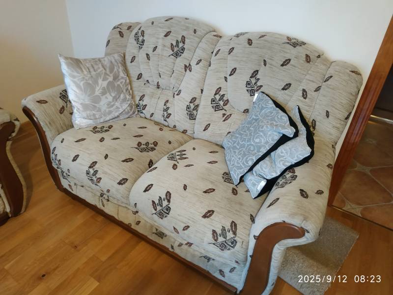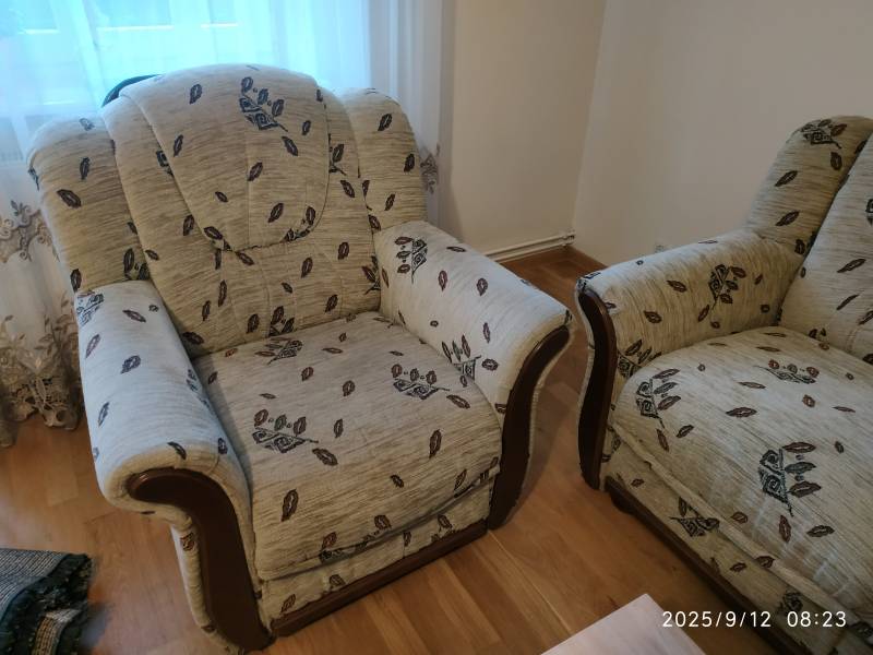 Zestaw wypoczynkowy składający się z 2 kanap, z których jedna posiada funkcję spania, fotela oraz pufy. Meble są w bardzo dobrym stanie a dodatkowo są bardzo wygodne.