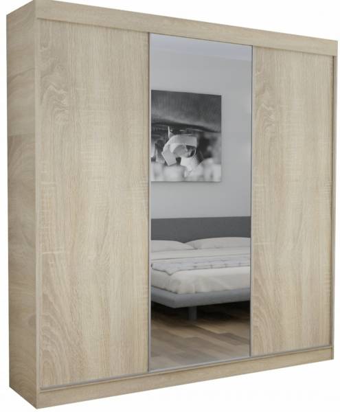 Nowoczesna szafa z lustrem w jasnym kolorze drewna. Idealna do sypialni lub garderoby. Zapewnia dużo miejsca do przechowywania ubrań i dodatków. Solidna konstrukcja i elegancki design sprawią, że będzie doskonałym uzupełnieniem Twojej aranżacji.