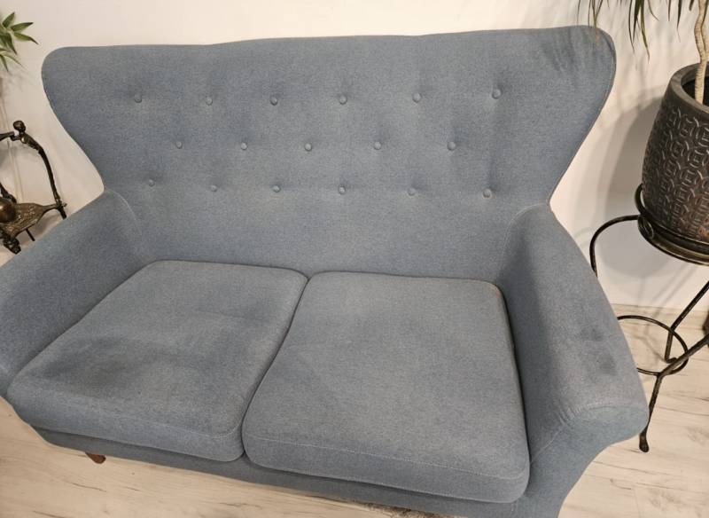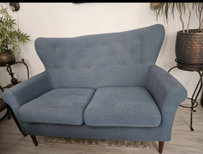 Wygodna, dwuosobowa sofa w kolorze niebieskim z praktycznym podnóżkiem. Mebel jest w bardzo dobrym stanie, idealny do salonu lub sypialni. Sofa posiada pikowany wzór. Podnóżek doskonale uzupełnia całość, zapewniając dodatkową wygodę podczas relaksu. W komplecie rowniez bardzo wygodny fotel w tym samym kolorze