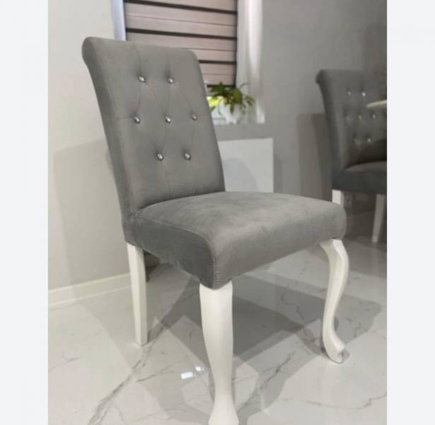 Komplet krzeseł glamour, nogi Ludwik, diamenty i kołatki. Materiał plamoodporny. Kupione za 2000zl. Odbiór Opole. Posiadam je rok, praktycznie nie używane, lekkie zadrapania na nogach, widoczne tylko z bliska. Jedyna wada to pęknięcie na jednej nodze ale tak już było od początku, a nie zauważyłam wady bo kilka miesięcy leżały zafoliowane z racji remontu.