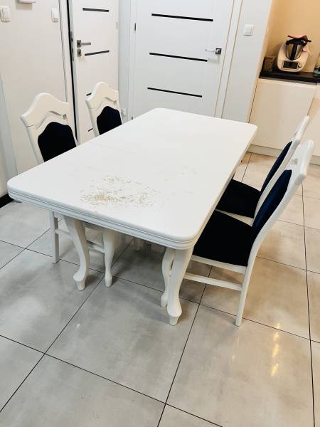 Sprzedam stół z czterema krzesłami. Stan dobry, jedynie blat stołu do odmalowania. Krzesła za to w bardzo dobrym stanie.