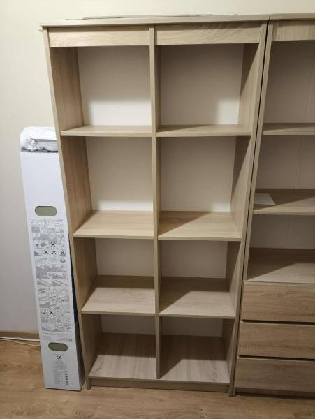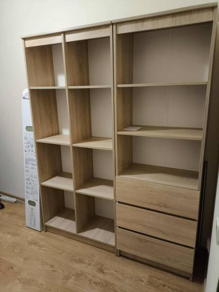 Oferuję dwa regały na książki w kolorze dąb sonoma. Stan bardzo dobry, nie mają uszkodzeń mechanicznych ani zarysowań na płycie. Ślady użytkowania również znikome.