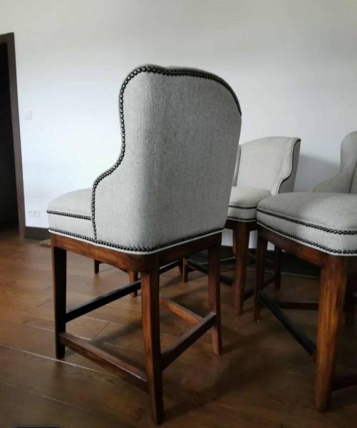 posiadam na sprzedaż w idealnym stanie 4 fotele hokerowe. Wykonane na zamówienie, nogi z litego drewna. Tapicerka z bardzo jakościowego naturalnego materiału.
