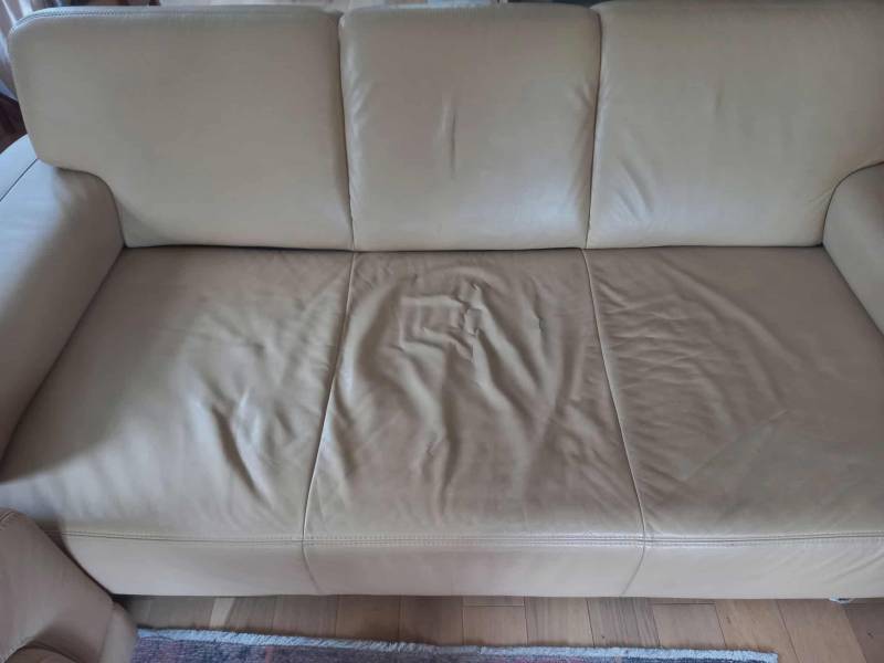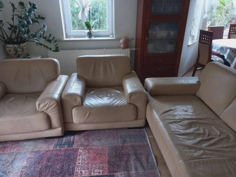 Chciałabym sprzedać meble wypoczynkowe kupione 10 lat temu: kanapa i 2 fotele. Całość ze skóry naturalnej w kolorze beżowym. Na siedzeniu kanapy jest małe rozdarcie, długości ok. 3 cm. Reszta mebli w stanie bardzo dobrym. Meble są ciężkie! Kanapa posiada funkcję spania.