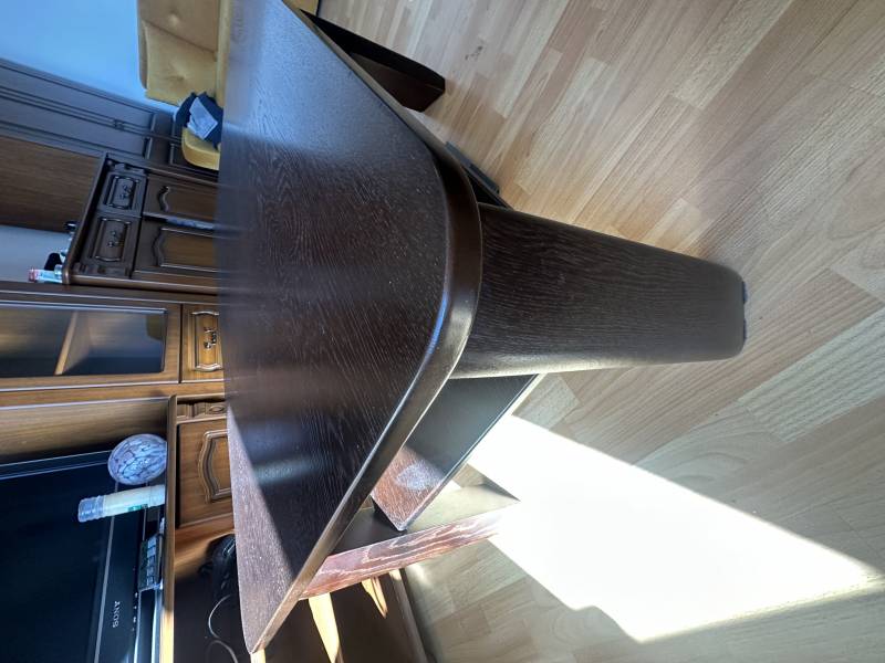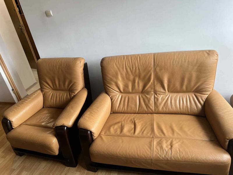 Skóra z klera + fotel i 2 pufy jak nowe z drzewa + stół drewniany Kler