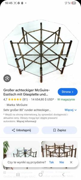 Oryginalny stół McGuire – szkło i rattan, designerski vintage, USA