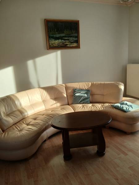 Wygodna, duża, sofa do siedzenia dla 6-8 osób idealna do salonu . Mebel wykonany na zamówienie w całości ze skóry ,również tył sofy , jest w dobrym stanie , wymiary długość 3 m szer. max 1,70 ( w zaokrągleniach po obu stronach ) . Z uwagi na oryginalny kształt i ciepły ecru/ beżowy kolor nadaje wnętrzu elegancki i przytulny charakter. Do transportu mebel można rozdzielić na 2 równe części .