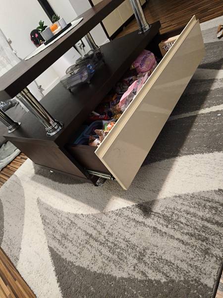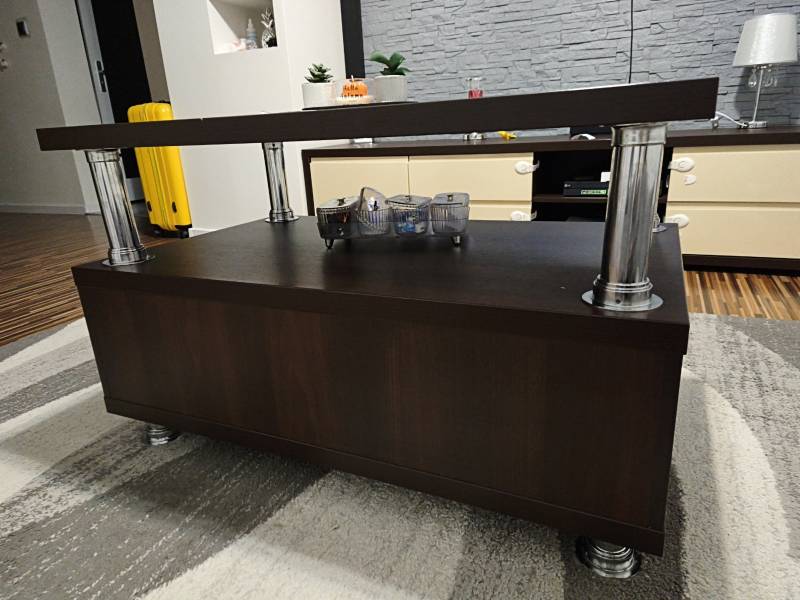 Orginalny, masywny stolik kawowy z szufladą wykonany przez stolarza na zamówienie kolor ciemny orzech, front z przodu lakierowany ecru.