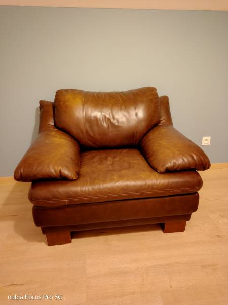 Solidne, skórzane fotele w kolorze brązowym. Mebel jest w dobrym stanie, jedyne ślady użytkowania widoczne na zdjęciu.