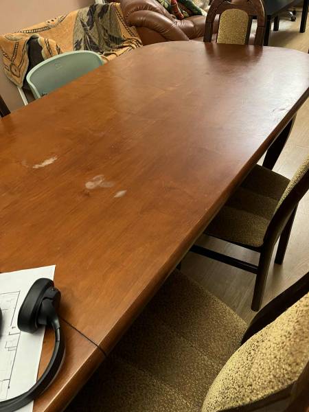 stół do jadalni wraz z krzesłami-(12 szt tapicerowane) o dł.300cm plus 50cm wstawka z śladami użytkowania do odbioru osobistego .Termin 07.01.2026-12.01.2026r