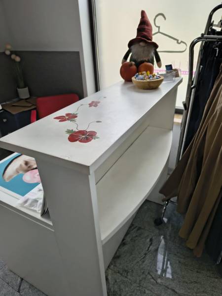 Oferuję drewniane, białe meble sklepowe z ręcznie malowanymi, unikatowymi wzorami – wykonane z prawdziwego drewna, nie sklejki, co gwarantuje trwałość i solidność na lata.