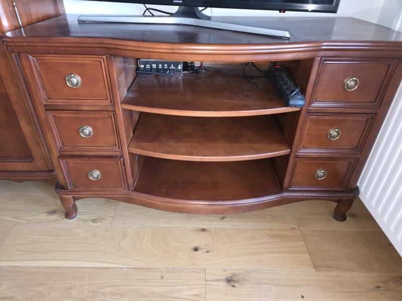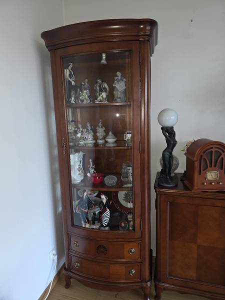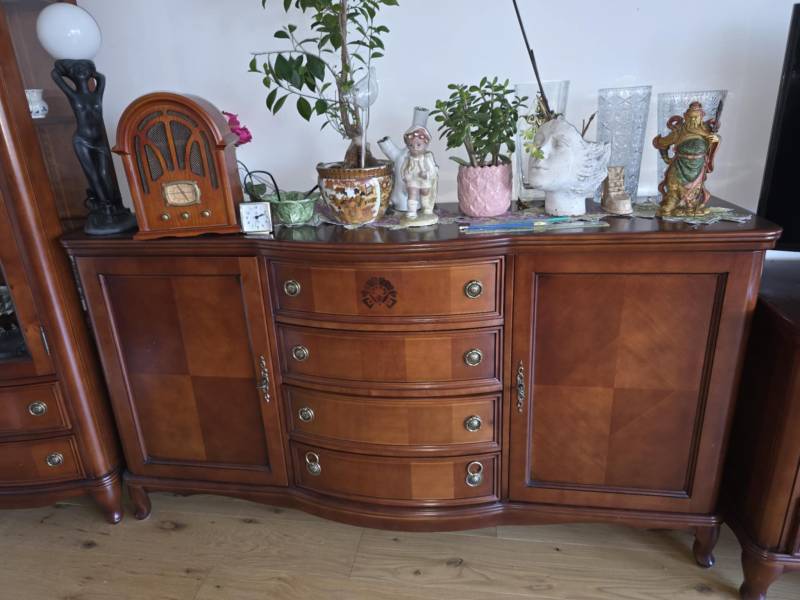 Na sprzedaż komplet mebli drewnianych. Szafka pod telewizor, komoda oraz gablotka ze światłem wewnątrz.