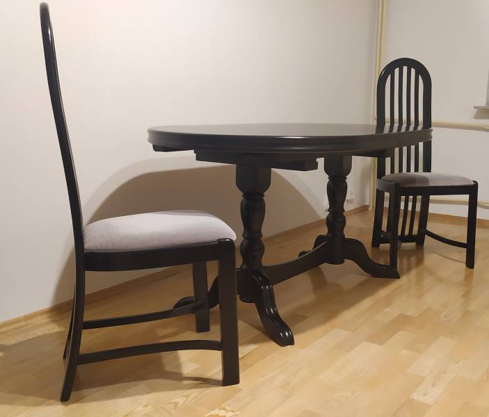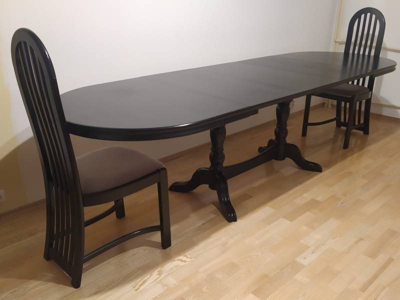 Witam. Mam do sprzedania kompletny, solidny, rozsuwany czarny stół drewniany Wiktor III + 8 czarnych, ciężkich, ale solidnych krzeseł. Trzy dodatkowe blaty do rozłożenia stołu są schowane wewnątrz mebla. Stół był używany. Stan nóg, blatów i krzeseł dobry. Skompletowany stół jest bardzo ciężki.