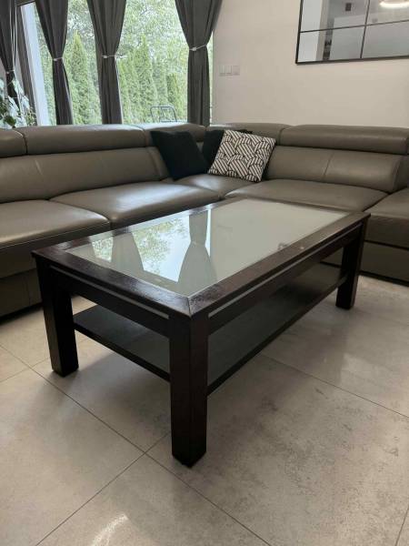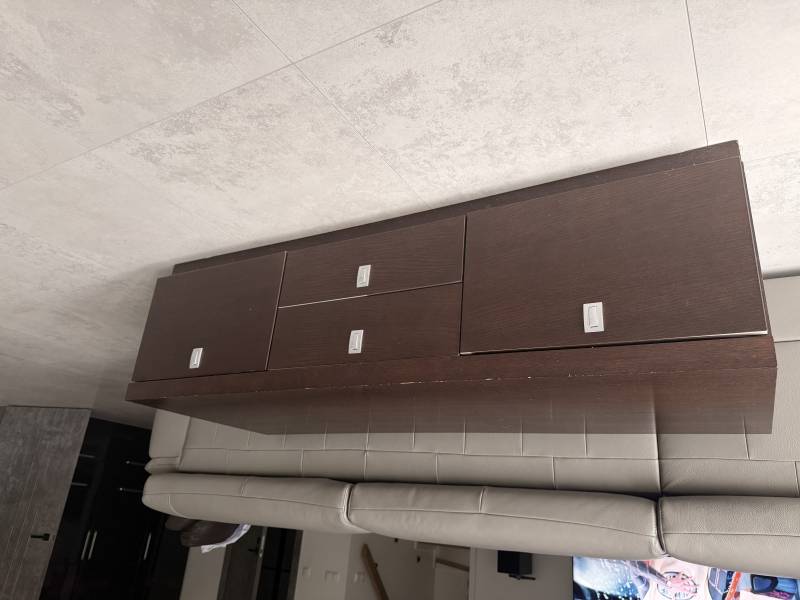 Zestaw mebli, ciemne drewno. Komoda, szafka RTV, panel RTV oraz ława
