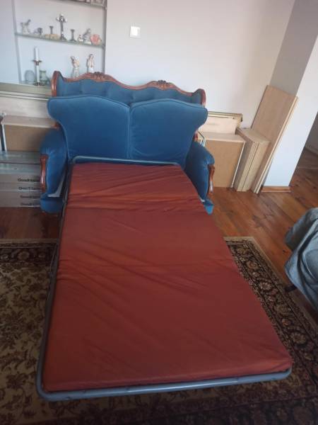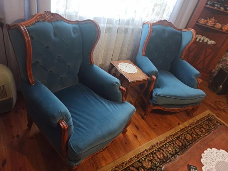 Meble składają cię z sofy dwuosobowej i trzech foteli. Sofa rozkładana, spanie dla dwóch osób. Meble ludwikowskie, tapicerka wymieniona dwa lata temu.
