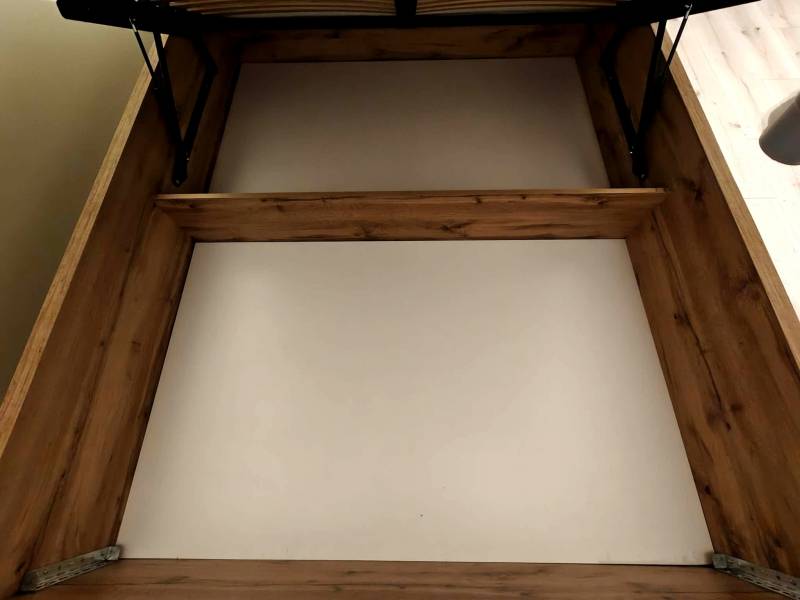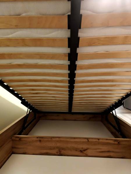 Sprzedam łóżko z pojemnikiem na pościel uchylanym od frontu o wymiarach 160x200 cm, wykonane z drewna w kolorze dębu wotan. Łóżko posiada stelaż i wygodne, tapicerowane wezgłowie. Materac sprężynowy kieszeniowy Ekko 160x200 H3. Używane sporadycznie, głównie w przypadku przyjazdu gości. Brak wad