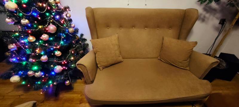 2 sofy dwuosobowe nierozkladane,jedna typu uszak,druga chyba biurowa.Uszak- kolor brązowy, biurowa pomarancz