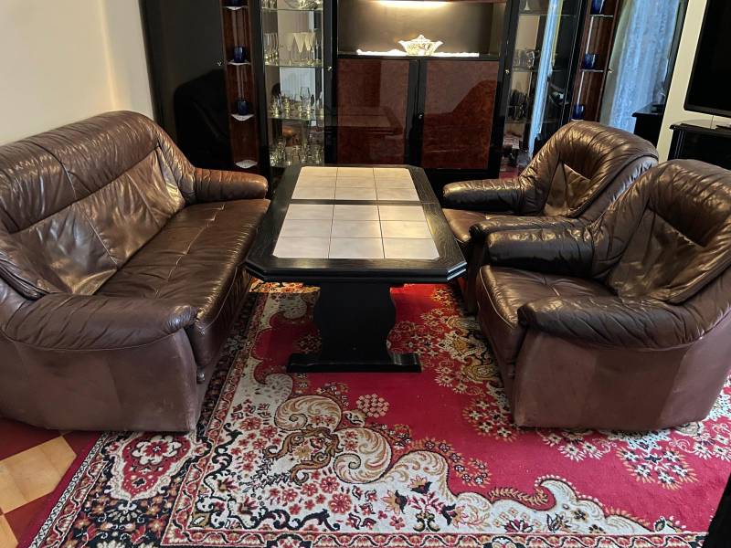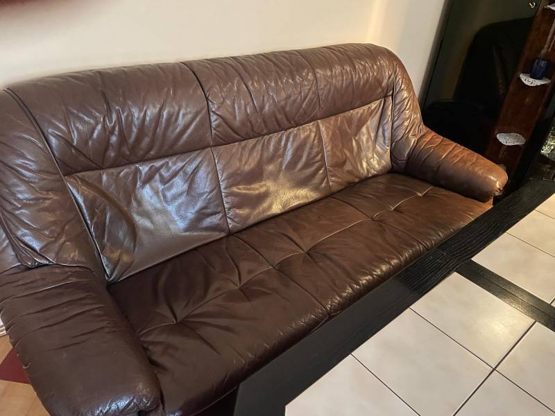 Kanapa skórzana z dwoma fotelami , ława , regał hiszpański w bardzo dobrym stanie i do tego szafka pod telewizor , telewizor