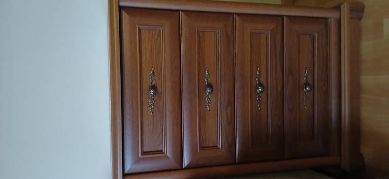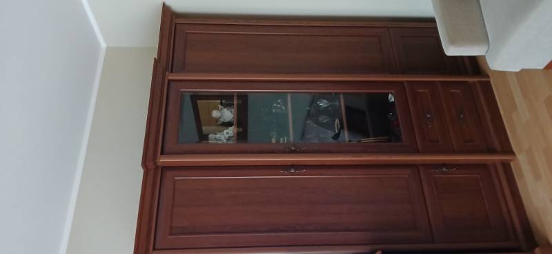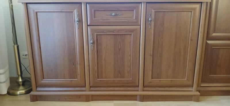 Meble pokojowe BRW - komoda, 2 witryny (jedna wąska , druga szersza), słupek z 4 szufladami)