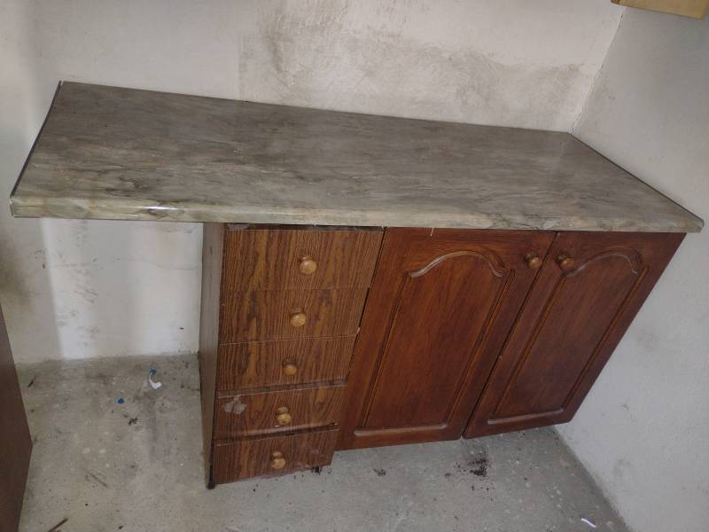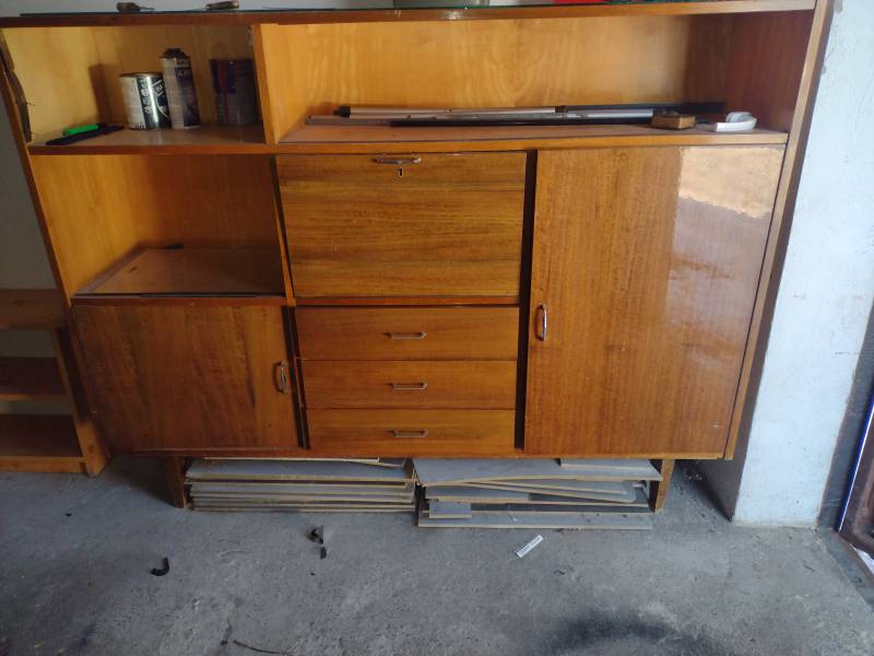 Kredens stary, podejrzewam że z PRL-u, komoda z blatem i szufladami , druga mała szafeczki z blatem, wiszące półki chyba też PRL, łóżeczko dziecięce 160 x 80 cm