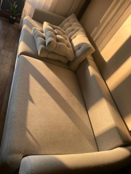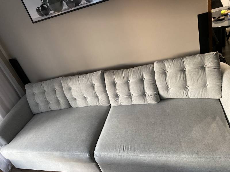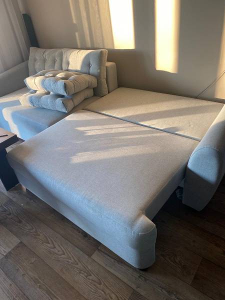 Duża kanapa w kolorze jasnoszarym. Kanapa jest łączona z 2 części. Obie mają funkcję spania (funkcja używana bardzo rzadko, tylko dla gości),2 x pojemnik na pościel. Jest bardzo wygodna do wieczornego odpoczynku. Kanapa była prana przez profesjonalistę 29.01.2025r. Nie posiada żadnych uszkodzeń czy przetarć oraz plam.