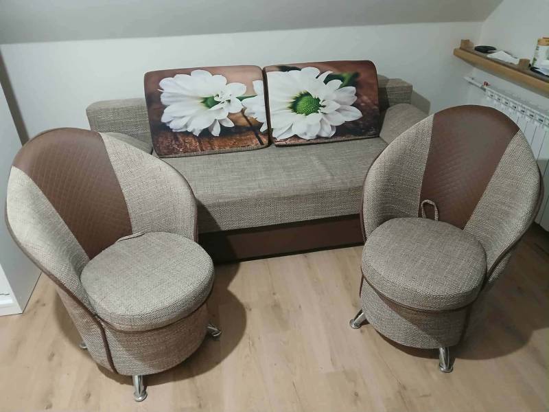 Chce tanio sprzedać meble wypoczynkowe. Kpl stanowi kanapa rozkładana z pojemnikiem i 2 fotele ze schowkiem. Stan mebli bardzo dobry w kolorze brązowym. Cena podlega negocjacji.