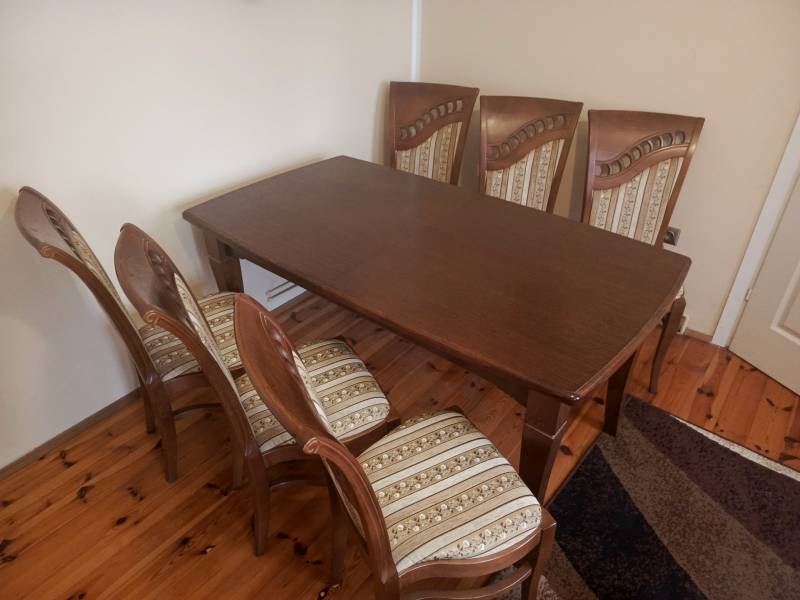 Stół drewniany 160x 90 z opcją rozsuwania. 6 krzeseł do kompletu.Kolor ciemny orzech.