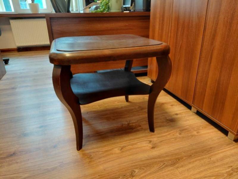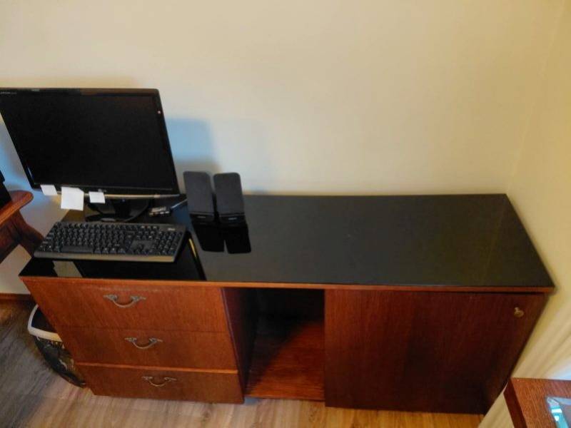 Komplet mebli biurowych w składzie: biurko, duża komoda, konsola, półka, stolik. Meble z litego drewna po renowacji.
