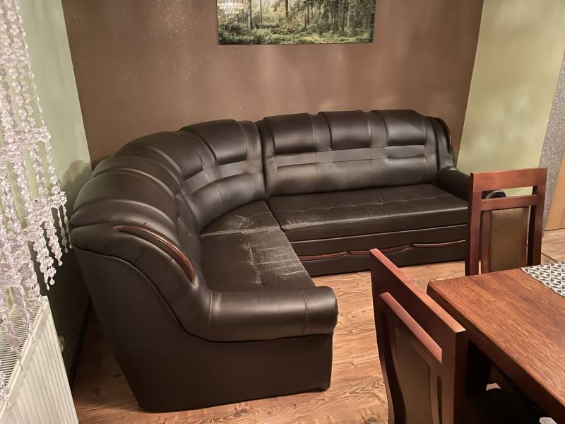 Narożnik skórzany w kolorze ciemnego brązu, kształt L.